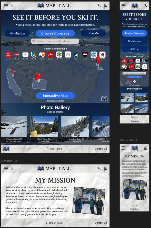 The concept for Map It All originated from my own experiences on the slopes, since I’ve been very interested in tracking my time skiing but could not find a reliable, centralized source of information for advice when doing a new trail or tour.